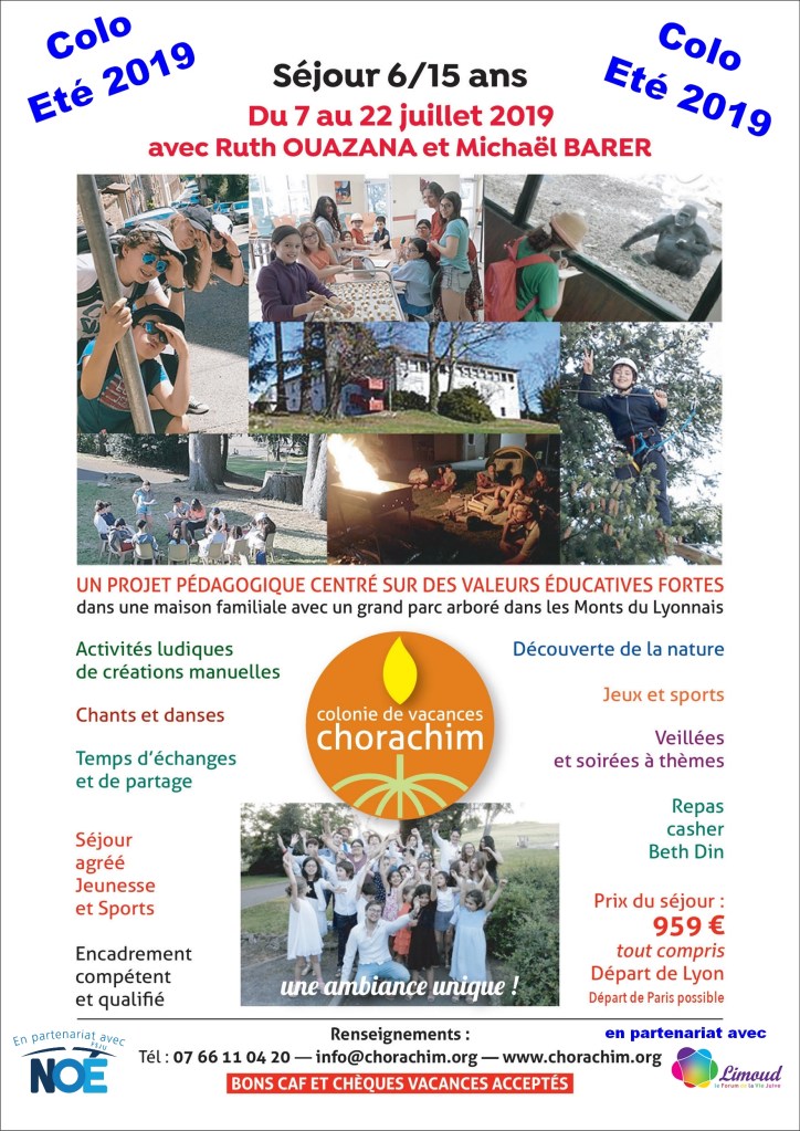 Après le succès rencontré en 2018, l’équipe Chorachim revient du 7 au 22 juillet 2019. Vos enfants et adolescents seront entourés pendant deux semaines d’arbres centenaires, dans une maison tout confort (toilettes et douches dans chaque chambre), avec à chaque repas des plats cachers délicieux, concoctés avec plaisir par notre équipe de cuisine.